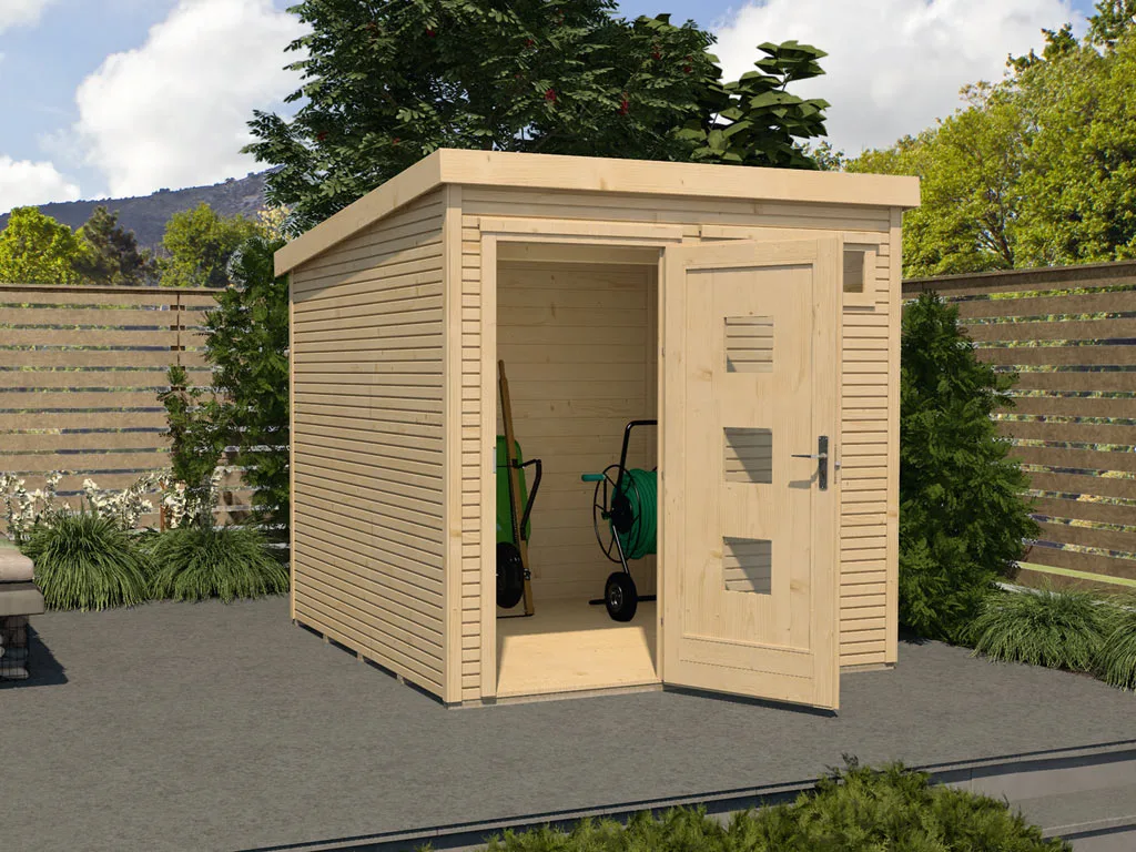Die Grundfläche des Gartenhauses beträgt 9,06 m² mit einem Sockelmaß von 295 x 301 cm (B x T). Eine optimale Raumnutzung wird dank einer Firsthöhe von 213 cm gewährt.