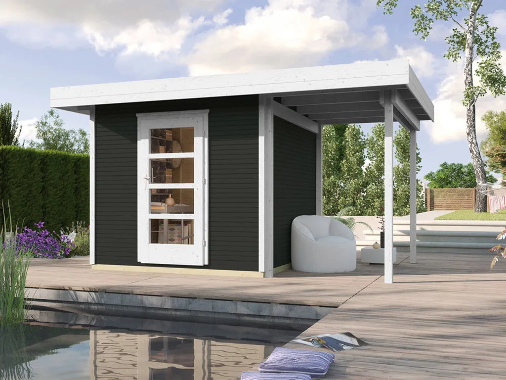 Für mehr Raum und vielfältige Nutzungsmöglichkeiten sorgt dieses Gartenhaus mit Anbaudach. Das großzügig geschnittene Anbaudach ermöglicht es, den Gartenalltag in vollen Zügen im Freien genießen zu können – geschützt vor Sonne, Wind und Regen. Der Platz unter dem Dach kann als gemütliche Terrasse zum Sitzen, Spielen oder Werkeln bei jedem Wetter genutzt werden. Alternativ eignet es sich auch als optimaler Unterstellplatz für zahlreiche Gartengeräte.