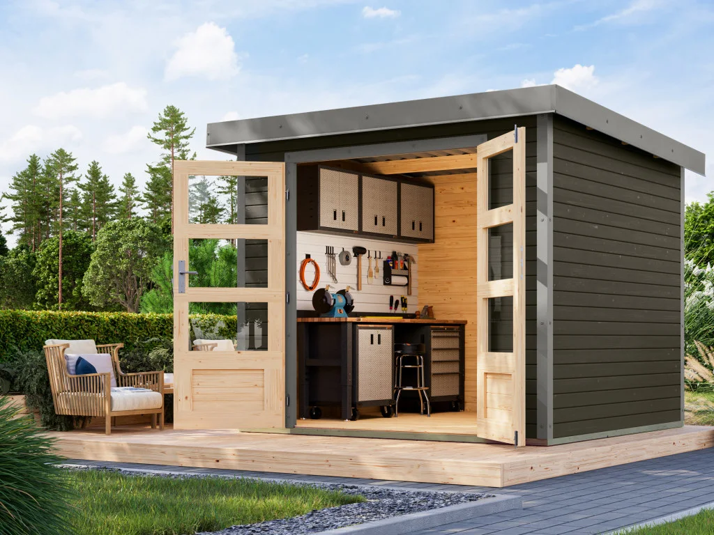Im Vergleich zu herkömmlichen Holzgartenhäusern sind Hybridhäuser von Karibu erheblich wartungsärmer. Die Stahlecken schützen besonders gut vor Witterung und die Häuser überzeugen durch ihre moderne Optik.