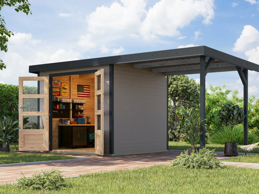 Gartenhaus Jupiter 3 19 mm wassergrau - anthrazit mit Anbaudach 2,35 m breit