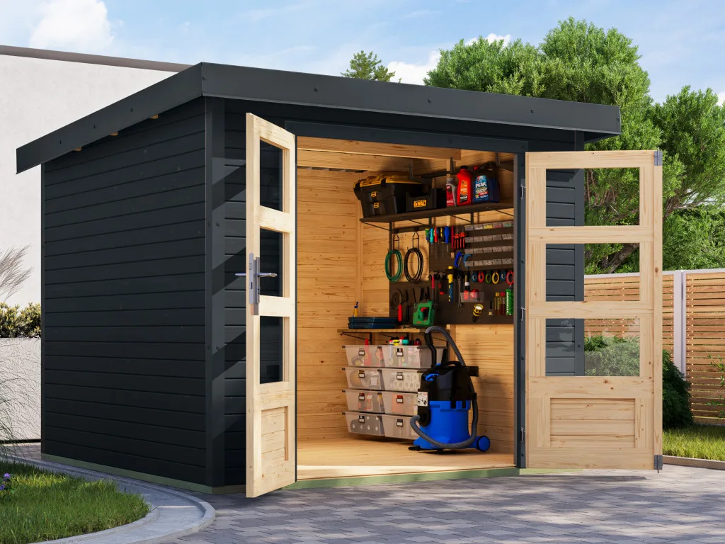 Ein modernes Pultdach verleiht deinem Gartenhaus eine stilvolle, elegante Optik. Durch nur eine geneigte Dachfläche ist die Nutzungsfläche im Inneren des Gartenhauses deutlich weniger eingeschränkt und der Verlust an Nutzraum gering. Zudem lässt die Neigungsseite des Pultdaches das Regenwasser gut abfließen und es ist die Montage von nur einer Regenrinne nötig. Des Weiteren sparst du dir Zeit und Geld bei der Montage des Daches. Durch die mitgelieferten Trapezbleche für das Dach muss kein weiteres Dachmaterial zur Eindeckung gekauft werden. Außerdem lassen sich die Platten schneller verlegen als Rauspund oder Spanplatten.