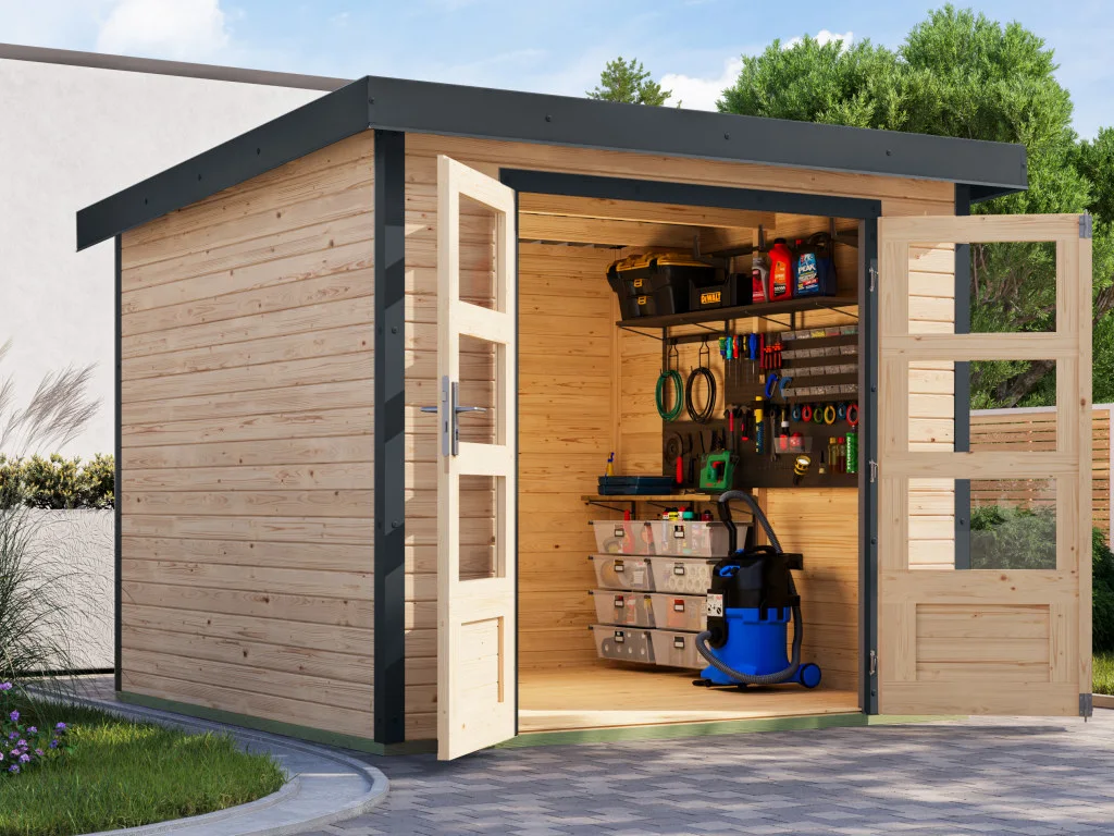 Im Vergleich zu herkömmlichen Holzgartenhäusern sind Hybridhäuser von Karibu erheblich wartungsärmer. Die Stahlecken schützen besonders gut vor Witterung und die Häuser überzeugen durch ihre moderne Optik.