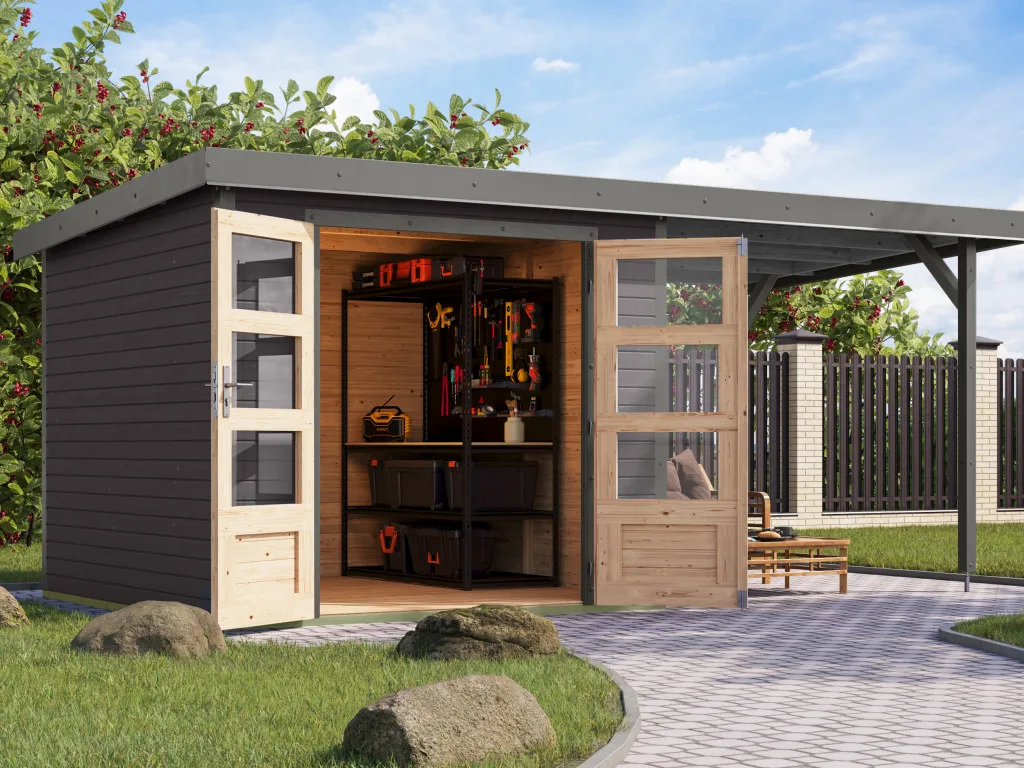 Im Vergleich zu herkömmlichen Holzgartenhäusern sind Hybridhäuser von Karibu erheblich wartungsärmer. Die Stahlecken schützen besonders gut vor Witterung und die Häuser überzeugen durch ihre moderne Optik.