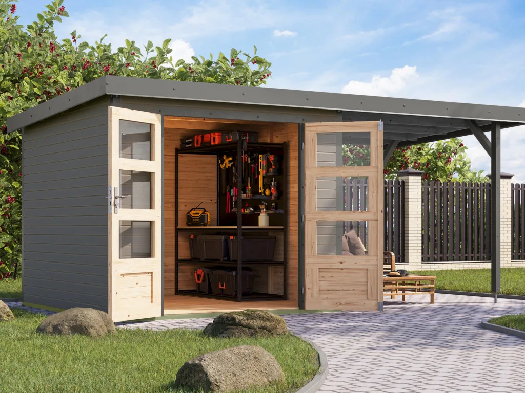 Gartenhaus Jupiter 3,5 19 mm wassergrau - graualuminium mit Anbaudach 2,35 m breit