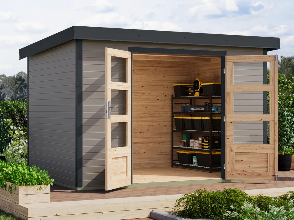Ein modernes Pultdach verleiht deinem Gartenhaus eine stilvolle, elegante Optik. Durch nur eine geneigte Dachfläche ist die Nutzungsfläche im Inneren des Gartenhauses deutlich weniger eingeschränkt und der Verlust an Nutzraum gering. Zudem lässt die Neigungsseite des Pultdaches das Regenwasser gut abfließen und es ist die Montage von nur einer Regenrinne nötig. Des Weiteren sparst du dir Zeit und Geld bei der Montage des Daches. Durch die mitgelieferten Trapezbleche für das Dach muss kein weiteres Dachmaterial zur Eindeckung gekauft werden. Außerdem lassen sich die Platten schneller verlegen als Rauspund oder Spanplatten.
