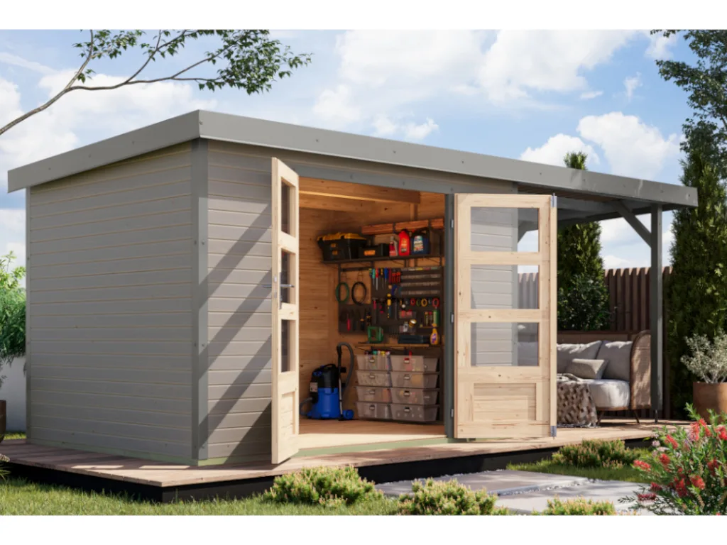 Gartenhaus Jupiter 4 19 mm wassergrau - graualuminium mit Anbaudach 2,35 m breit