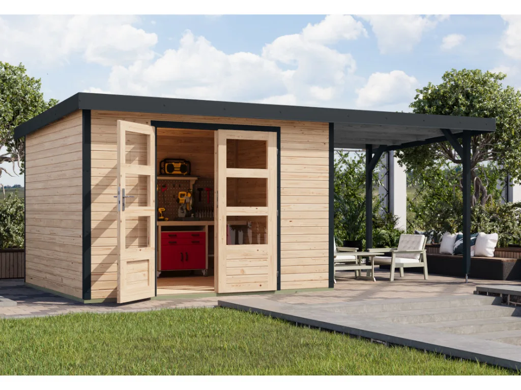 Gartenhaus Jupiter 5 19 mm naturbelassen - anthrazit mit Anbaudach 2,35 m breit