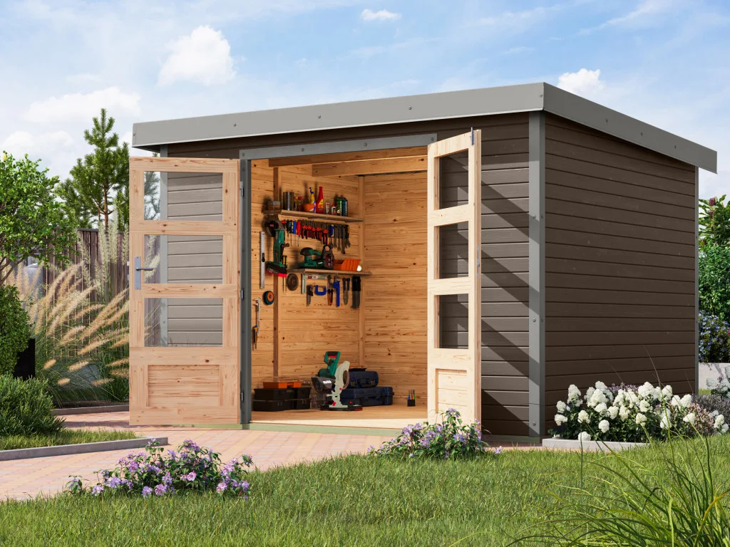 Ein modernes Pultdach verleiht deinem Gartenhaus eine stilvolle, elegante Optik. Durch nur eine geneigte Dachfläche ist die Nutzungsfläche im Inneren des Gartenhauses deutlich weniger eingeschränkt und der Verlust an Nutzraum gering. Zudem lässt die Neigungsseite des Pultdaches das Regenwasser gut abfließen und es ist die Montage von nur einer Regenrinne nötig. Des Weiteren sparst du dir Zeit und Geld bei der Montage des Daches. Durch die mitgelieferten Trapezbleche für das Dach muss kein weiteres Dachmaterial zur Eindeckung gekauft werden. Außerdem lassen sich die Platten schneller verlegen als Rauspund oder Spanplatten.