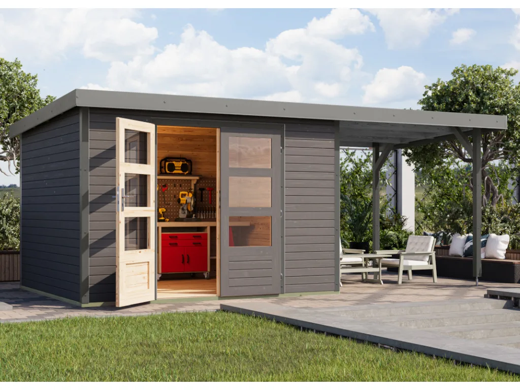 Im Vergleich zu herkömmlichen Holzgartenhäusern sind Hybridhäuser von Karibu erheblich wartungsärmer. Die Stahlecken schützen besonders gut vor Witterung und die Häuser überzeugen durch ihre moderne Optik.