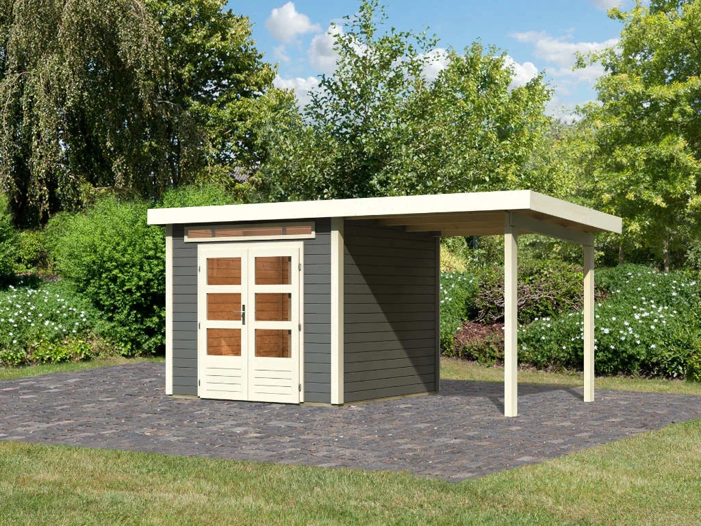 Für mehr Raum und vielfältige Nutzungsmöglichkeiten sorgt dieses Gartenhaus mit Anbaudach. Das großzügig geschnittene Anbaudach ermöglicht es, den Gartenalltag in vollen Zügen im Freien genießen zu können – geschützt vor Sonne, Wind und Regen. Der Platz unter dem Dach kann als gemütliche Terrasse zum Sitzen, Spielen oder Werkeln bei jedem Wetter genutzt werden. Alternativ eignet es sich auch als optimaler Unterstellplatz für zahlreiche Gartengeräte.