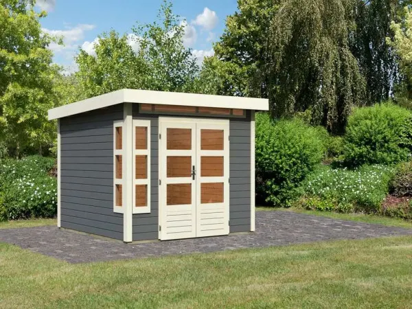 Das Gartenhaus wird aus 28 mm starken Wandbrettern aus nordischer Fichte im Steck-/Schraubsystem gefertigt und gewährleistet somit einen einfachen Aufbau und eine stabile Konstruktion. Das Pultdach besteht aus Masssivholzdach.