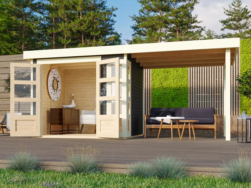 Für mehr Raum und vielfältige Nutzungsmöglichkeiten sorgt dieses Gartenhaus mit Anbaudach. Das großzügig geschnittene Anbaudach ermöglicht es, den Gartenalltag in vollen Zügen im Freien genießen zu können – geschützt vor Sonne, Wind und Regen. Der Platz unter dem Dach kann als gemütliche Terrasse zum Sitzen, Spielen oder Werkeln bei jedem Wetter genutzt werden. Alternativ eignet es sich auch als optimaler Unterstellplatz für zahlreiche Gartengeräte.