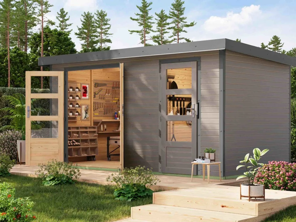 Im Vergleich zu herkömmlichen Holzgartenhäusern sind Hybridhäuser von Karibu erheblich wartungsärmer. Die Stahlecken schützen besonders gut vor Witterung und die Häuser überzeugen durch ihre moderne Optik.