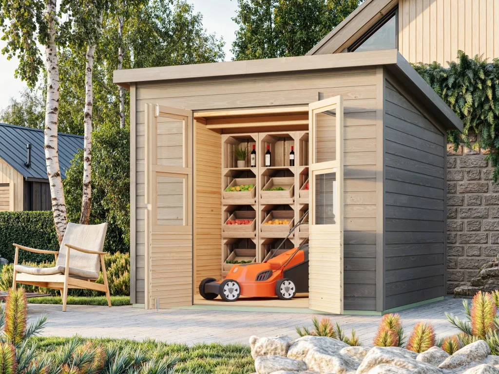 Die Grundfläche des Gartenhauses beträgt 5,74 m². Eine optimale Raumnutzung wird dank einer Firsthöhe von 219 cm gewährt.