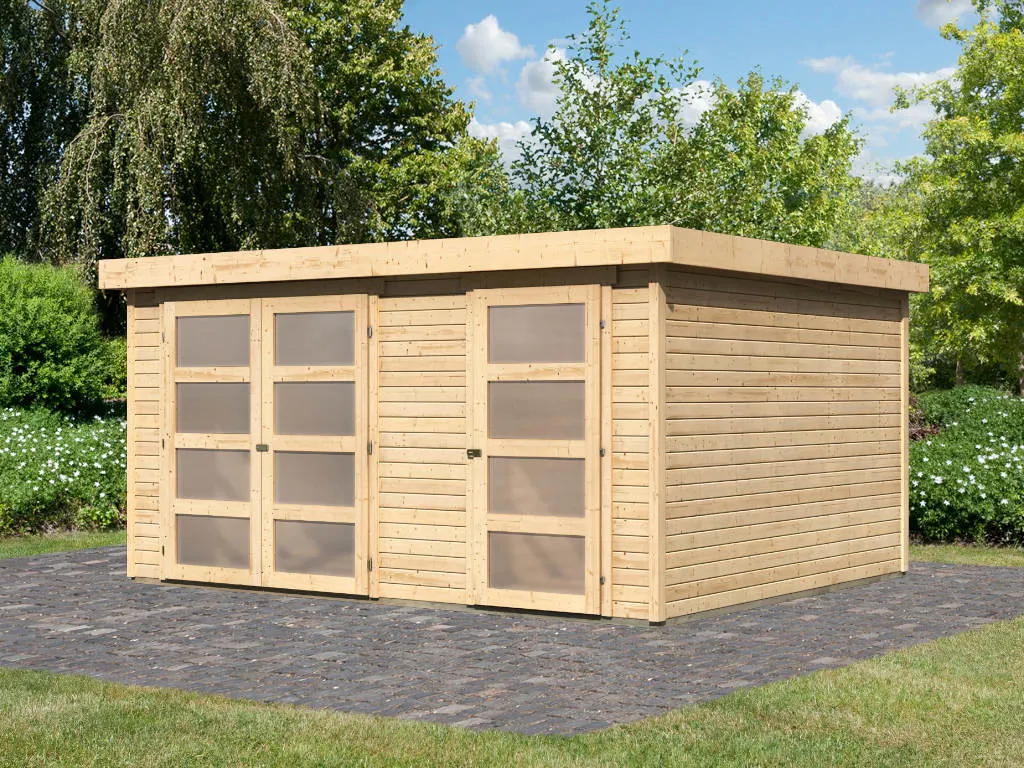 Die Grundfläche des Gartenhauses beträgt 13,16 m². Das Sockelmaß (Haus ohne Anbau) liegt bei 400 x 329 (B x T). Eine optimale Raumnutzung wird dank einer Firsthöhe von 212 cm gewährt.