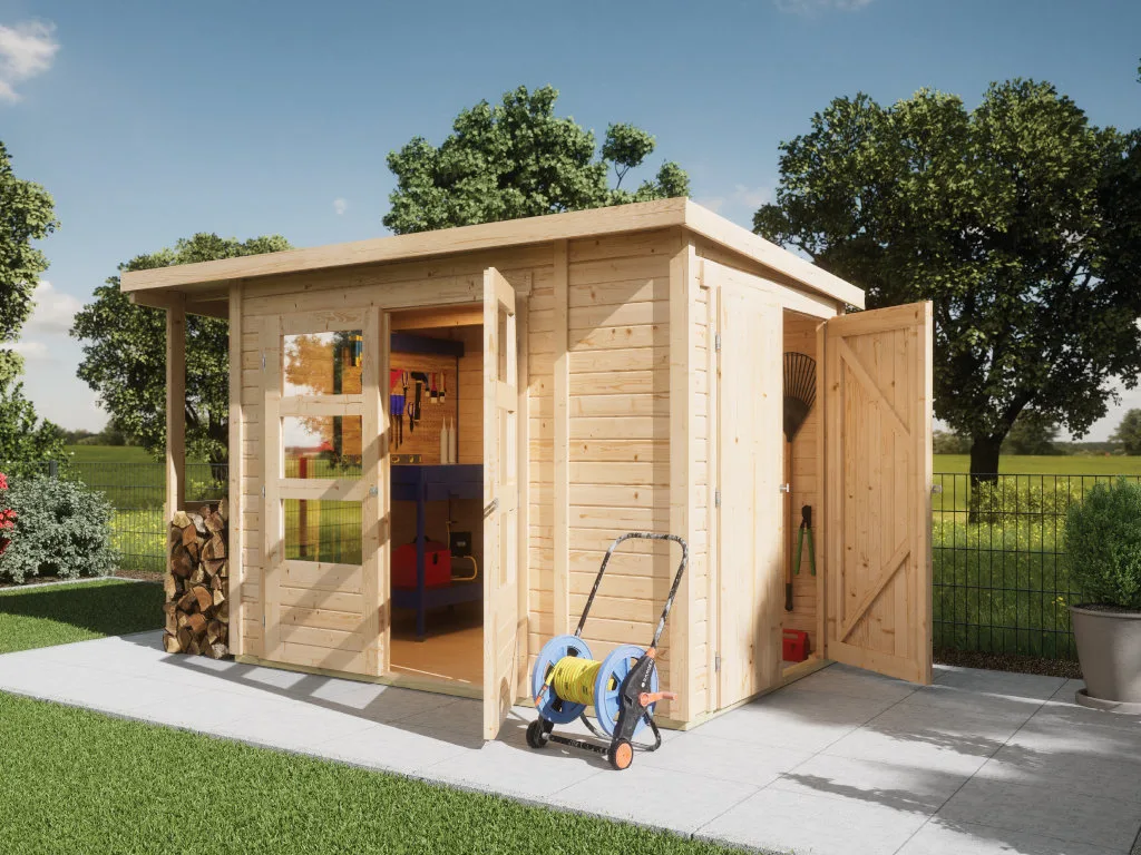 Für besonders viel Stauraum sorgt das Gartenhaus dank Anbauschrank, der mitgeliefert wird. Der zusätzliche Anbauschrank eignet sich optimal als Lagerplatz für Gartenmöbel und Gartenutensilien. Durch die Überdachung sind diese stets vor Regen und Sonne geschützt.
