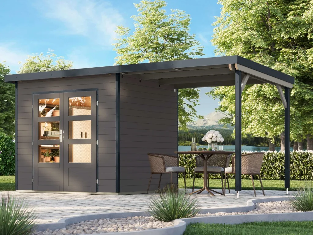 Gartenhaus Pluto 2 28 mm SET terragrau / anthrazit mit Anbau