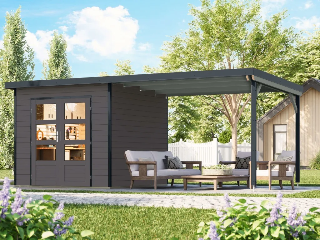 Gartenhaus Pluto 3 28 mm SET terragrau / anthrazit mit Anbau