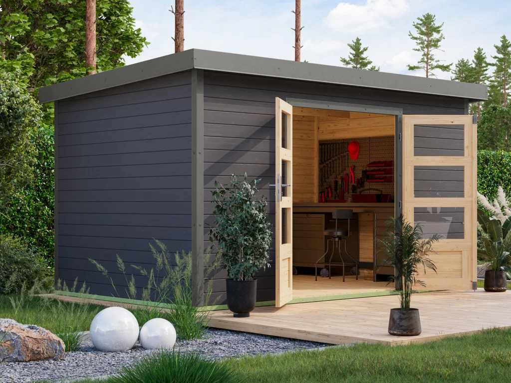 Im Vergleich zu herkömmlichen Holzgartenhäusern sind Hybridhäuser von Karibu erheblich wartungsärmer. Die Stahlecken schützen besonders gut vor Witterung und die Häuser überzeugen durch ihre moderne Optik.