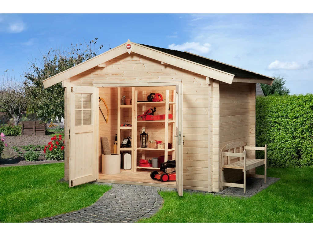 Als der Klassiker unter den Gartenhäusern verfügt ein Blockbohlenhaus über eine sehr robuste Bauweise, gepaart mit einer besonderen, natürlichen Ästhetik. Dabei orientiert sich die Bohlenbauweise an der traditionellen Blockhütte. Die Wände setzen sich aus vorgefertigten Holzbohlen zusammen, die dank einer Nut- und Feder-Verbindung ohne größere Anstrengungen aufeinander gesteckt werden können. Damit ist ein einfacher und schneller Auf- und Abbau garantiert. An der Kopfseite des Gartenhauses sorgt die charakteristische Verkämmung (spezielle Einkerbungen im Holz) nicht nur für eine schöne Optik, sondern hält das ganze Konstrukt auch zusammen und macht es absolut wind- und wetterfest.