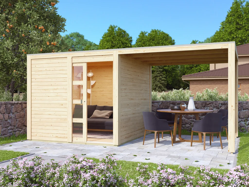 Gartenhaus Qubic-Cubino 19 mm naturbelassen inkl. Anbaudach 2,4 m