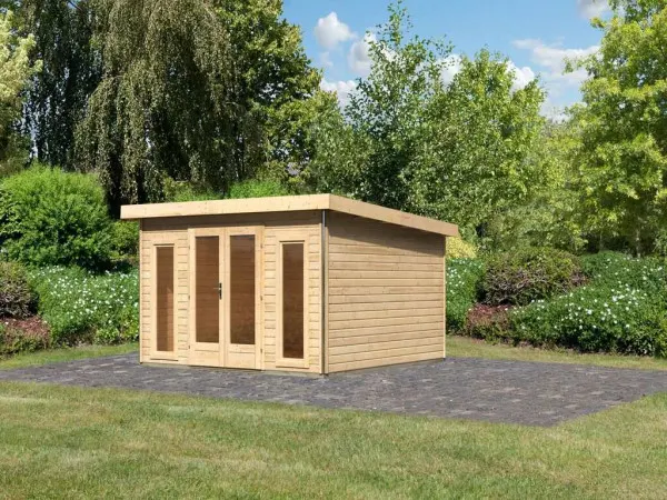 Das Gartenhaus wird aus 40 mm starken Wandbrettern aus nordischer Fichte im Steck-/Schraubsystem gefertigt und gewährleistet somit einen einfachen Aufbau und eine extrem stabile Konstruktion mit doppeltem Nut- und Federbereich der Wandbretter. Das Pultdach besteht aus Massivholzdach.