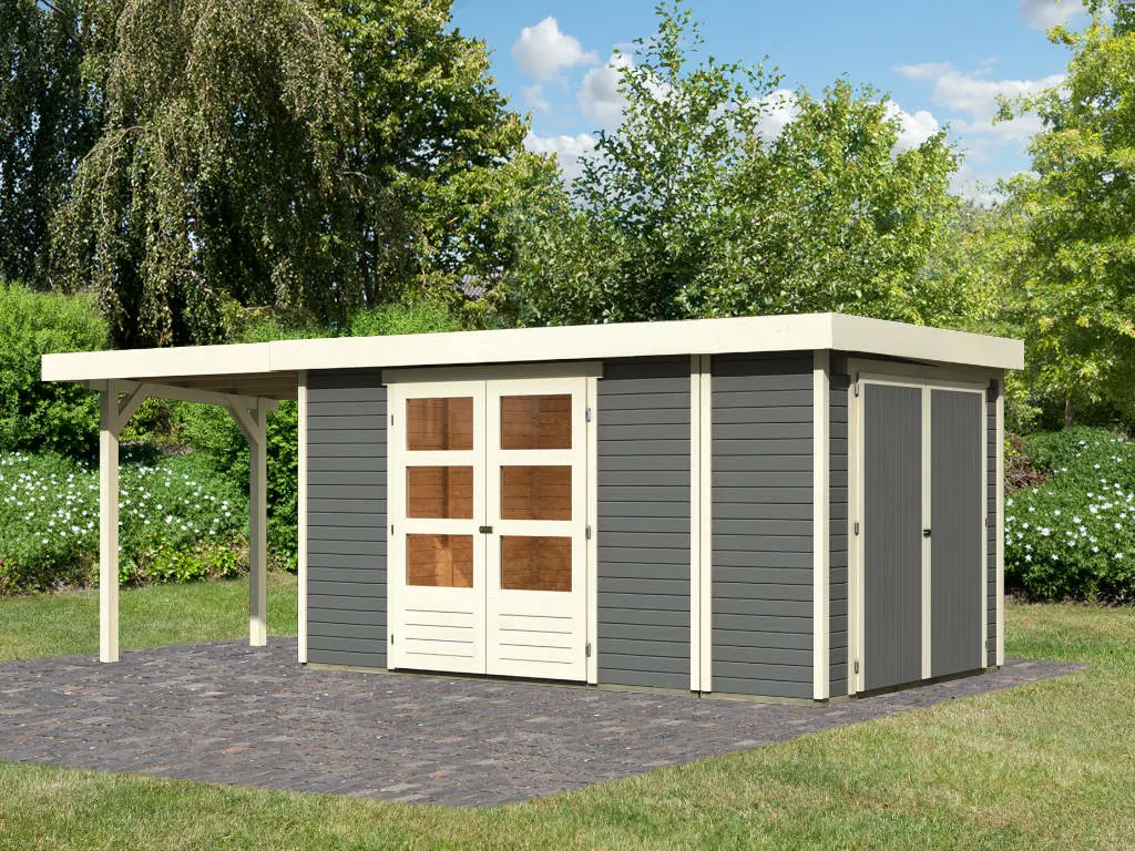 Für besonders viel Stauraum sorgt das Gartenhaus dank Anbauschrank, der mitgeliefert wird. Das Anbaudach und der zusätzliche Anbauschrank eignen sich optimal als Lagerplatz für Gartenmöbel und Gartenutensilien. Durch die Überdachung sind diese stets vor Regen und Sonne geschützt.