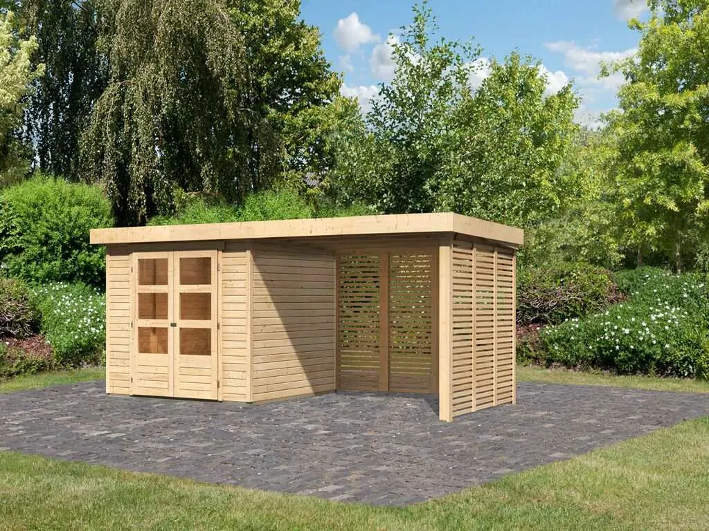 Das Gartenhaus mit Anbaudach ermöglicht eine multifunktionale Nutzung. Das Anbaudach schafft zusätzlichen Stauraum für Gartengeräte oder Fahrräder. Durch die Lamellenwände sind Deine Geräte optimal gegen Wind, Regen und die Blicke neugieriger Nachbarn geschützt. Alternativ kann der Platz unterm Anbaudach auch als gemütlicher Ort zum Sitzen und Verweilen genutzt werden. Lamellen sorgen für eine gute Durchlüftung und besonders im Sommer verhindern sie die unangenehme Stauhitze.