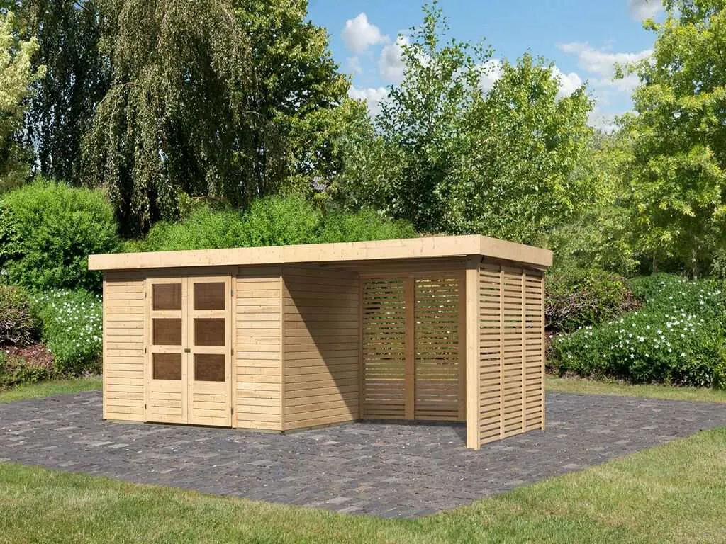 Das Gartenhaus mit Anbaudach ermöglicht eine multifunktionale Nutzung. Das Anbaudach schafft zusätzlichen Stauraum für Gartengeräte oder Fahrräder. Durch die Lamellenwände sind Deine Geräte optimal gegen Wind, Regen und die Blicke neugieriger Nachbarn geschützt. Alternativ kann der Platz unterm Anbaudach auch als gemütlicher Ort zum Sitzen und Verweilen genutzt werden. Lamellen sorgen für eine gute Durchlüftung und besonders im Sommer verhindern sie die unangenehme Stauhitze.