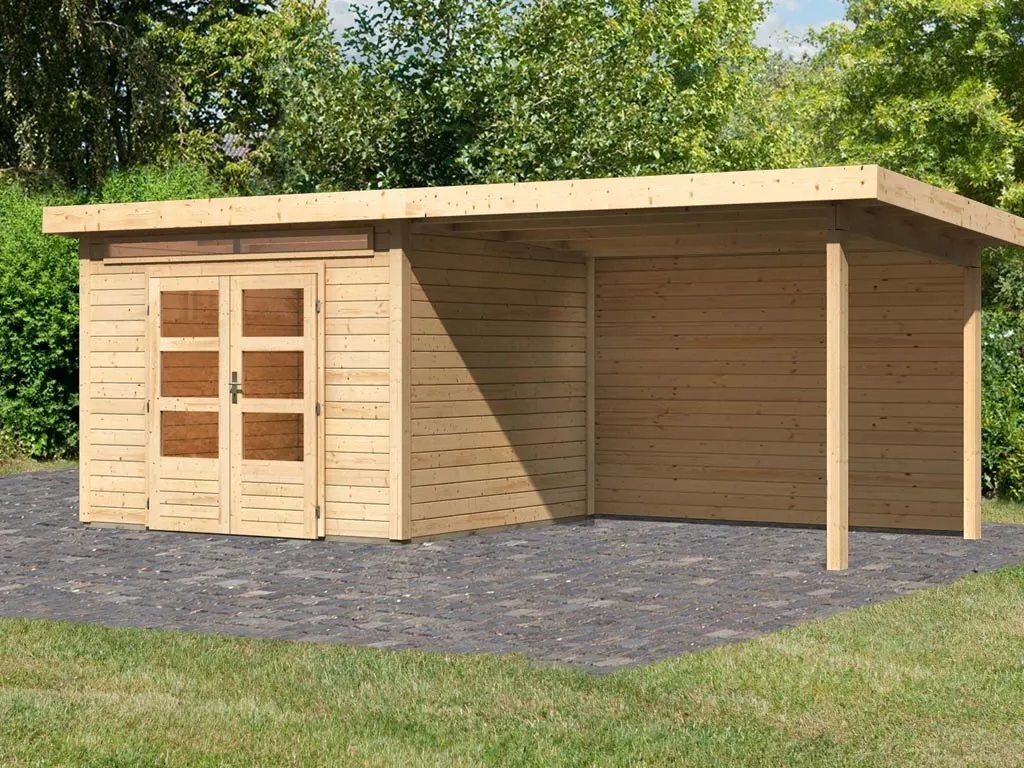 Das Gartenhaus mit Anbaudach und Rückwand ist sehr vielseitig. Der durch das Anbaudach geschaffene zusätzliche Stauraum eignet sich optimal als Lagerplatz für Gartenutensilien oder als Sitzbereich zum gemütlichen Verweilen. Dank Überdachung und integrierter Rückwand sind Geräte und Gartenmöbel optimal vor Wind und Wetter geschützt.