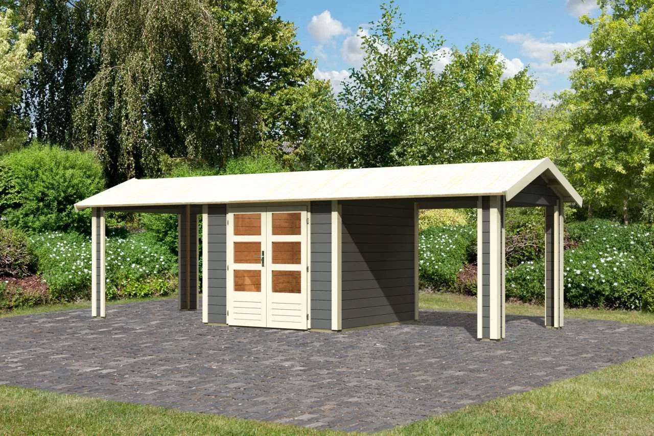 Gartenhaus SET Theres 3 28 mm terragrau inkl. zwei 2,6 m Dachausbauelemente