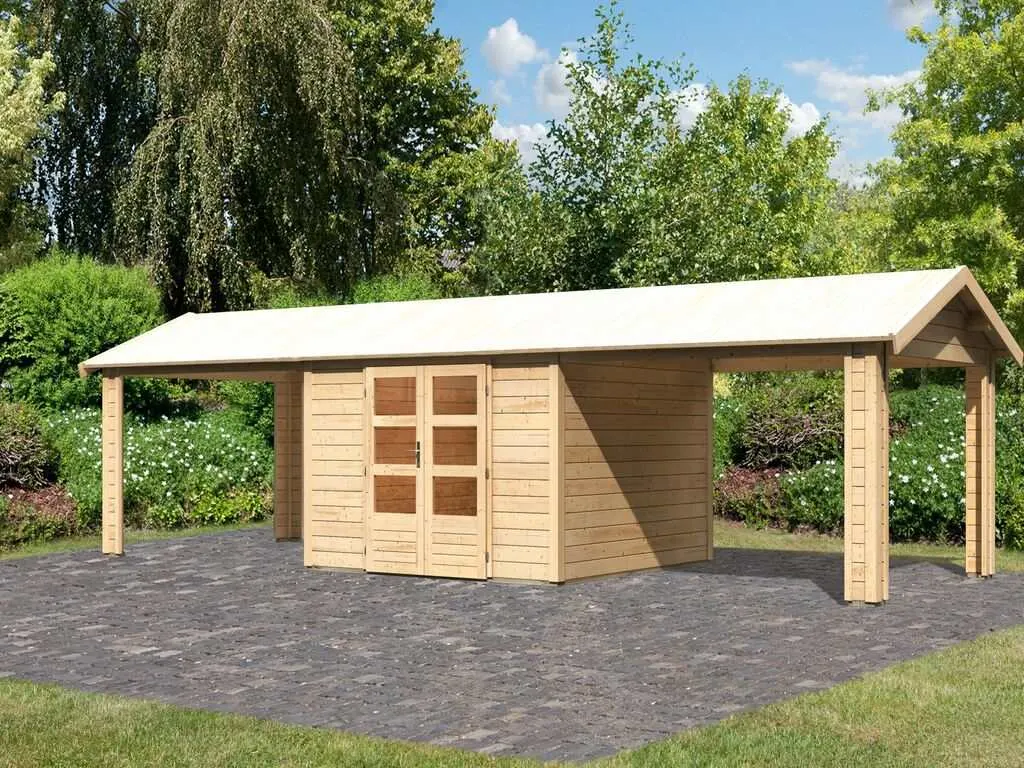 Gartenhaus SET Theres 7 28 mm naturbelassen inkl. zwei 2,6 m Dachausbauelemente