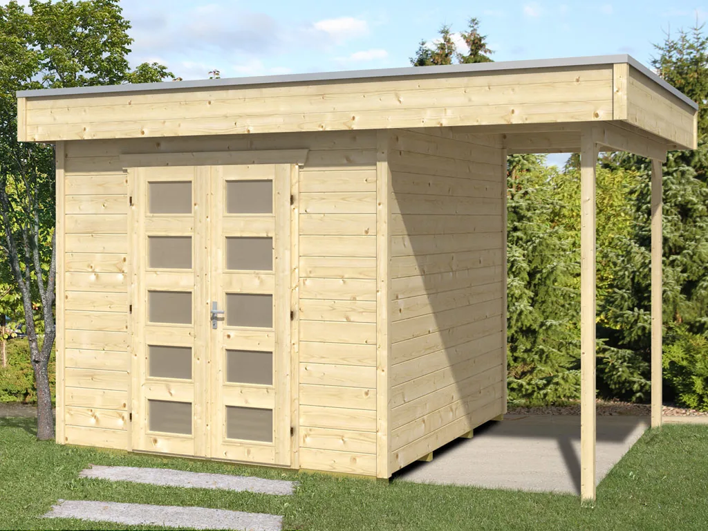 Für mehr Raum und vielfältige Nutzungsmöglichkeiten sorgt dieses Gartenhaus mit Anbaudach. Das großzügig geschnittene Anbaudach ermöglicht es, den Gartenalltag in vollen Zügen im Freien genießen zu können – geschützt vor Sonne, Wind und Regen. Der Platz unter dem Dach kann als gemütliche Terrasse zum Sitzen, Spielen oder Werkeln bei jedem Wetter genutzt werden. Alternativ eignet es sich auch als optimaler Unterstellplatz für zahlreiche Gartengeräte.