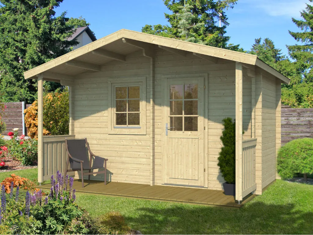 B x T x H: 430 x 330 x 268 cm, Sockelmaß B x T: 380 x 200 cm, Blockbohlenbauweise + Liegebänke inklusive