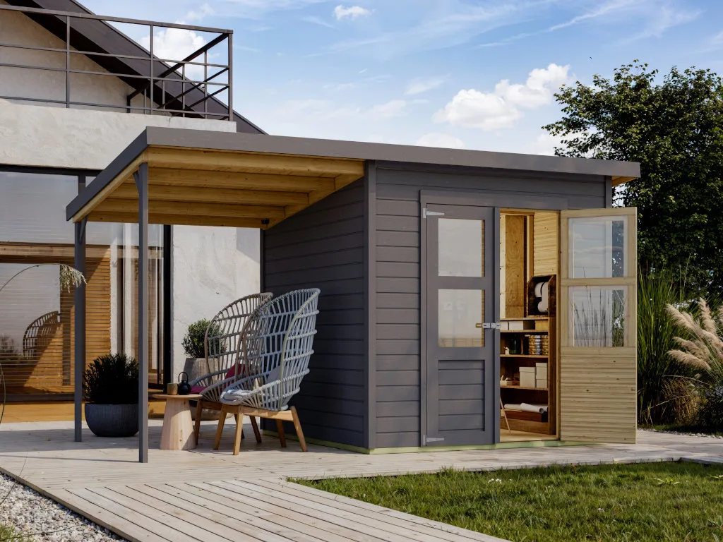 Für mehr Raum und vielfältige Nutzungsmöglichkeiten sorgt dieses Gartenhaus mit Anbaudach. Das großzügig geschnittene Anbaudach ermöglicht es, den Gartenalltag in vollen Zügen im Freien genießen zu können – geschützt vor Sonne, Wind und Regen. Der Platz unter dem Dach kann als gemütliche Terrasse zum Sitzen, Spielen oder Werkeln bei jedem Wetter genutzt werden. Alternativ eignet es sich auch als optimaler Unterstellplatz für zahlreiche Gartengeräte.