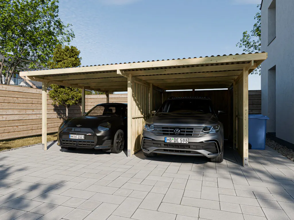 Ein Carport ist die ideale Lösung, um dein Auto vor der Witterung, Baumharz und Vogelkot zu schützen. Plus: Die offene Bauweise mit guter Luftzirkulation gewährleistet eine schnelle Trocknung bei Regen und Schnee und sorgt so für optimalen Korrosionsschutz. Mit einem Außenmaß von 595 x 495 cm bietet dieser Carport ausreichend Platz für zwei Fahrzeuge und mehr.