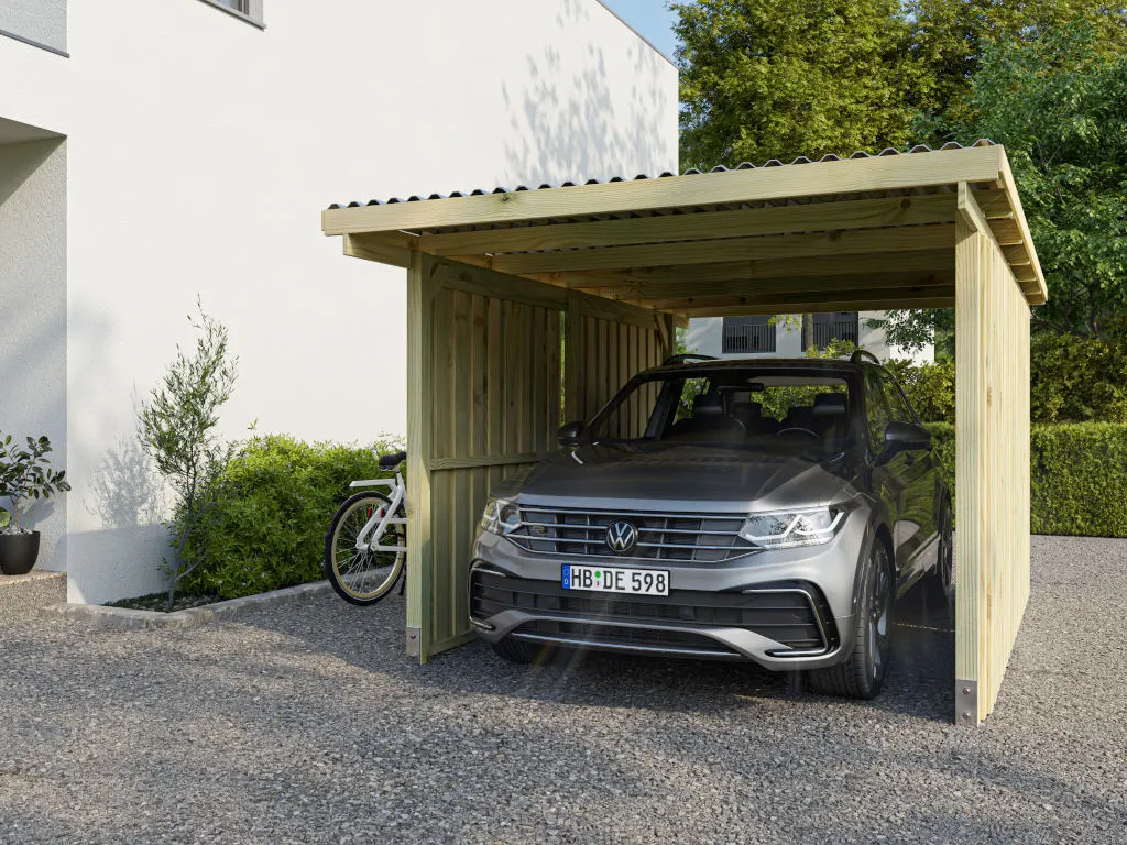 Ein Carport ist die ideale Lösung, um dein Auto vor Witterung, Baumharz und Vogelkot zu schützen. Außerdem gewährleistet die offene Bauweise mit guter Luftzirkulation eine schnelle Trocknung bei Regen und Schnee und sorgt so für optimalen Korrisionsschutz. Auch mit zwei Seitenwänden bietet dir der Carport ausreichend Zugang zu Luft. Mit einer Größe von 300 x 500 x 210 cm (B x T x H) bietet dieser Carport ausreichend Platz für dein Fahrzeug und mehr.