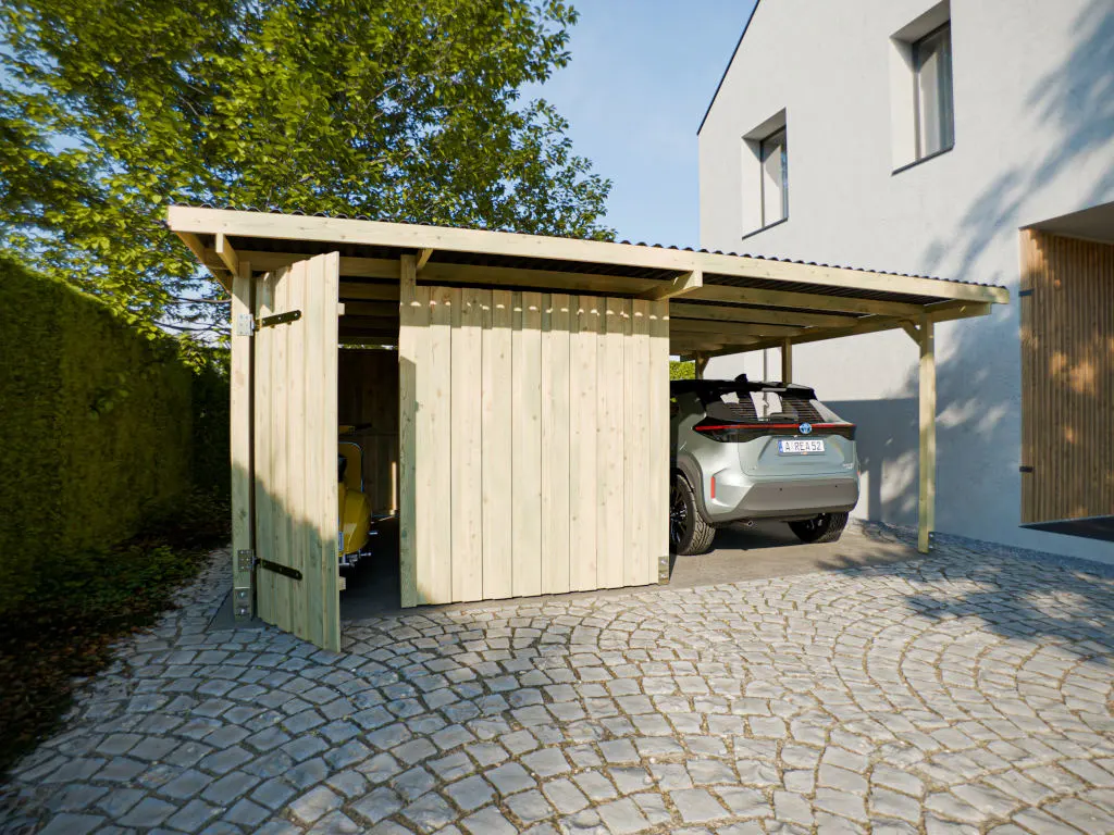 Der Carport ist aus hochwertigem Fichten- und Kiefernholz gefertigt. Kiefer ist leicht zu bearbeiten und besitzt eine gleichmäßige gerade Faserstruktur. Auch ist Kiefernholz dank kurzer Transportwege das preiswerteste heimische Holz. Fichte ist besonders langlebig und robust, was für die notwendige Stabilität sorgt. Außerdem überzeugt die Holzart mit geringem Gewicht, einer leichten Verarbeitung und hoher Elastizität.