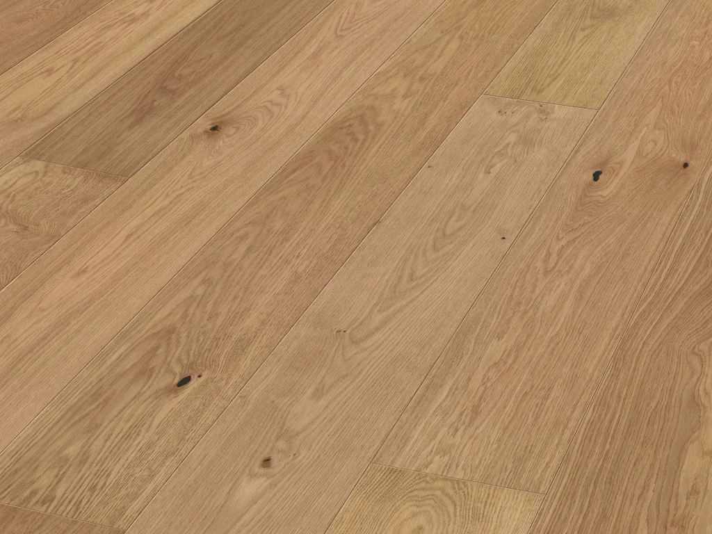 Das Parkett ist lebhaft gemasert: In dieser Sortierung bieten wir bewusst Oberflächen mit Farb- und Strukturspiel, die den natürlichen Charakter des Holzes betonen. Gesunde, festverwachsene Äste, Splint- und Braunkernanteile gehören zum lebhaften Gesamtbild. Äste werden ausgespachtelt. Vereinzelt können kleine, nicht spachtelfähige Äste und Risse vorkommen.