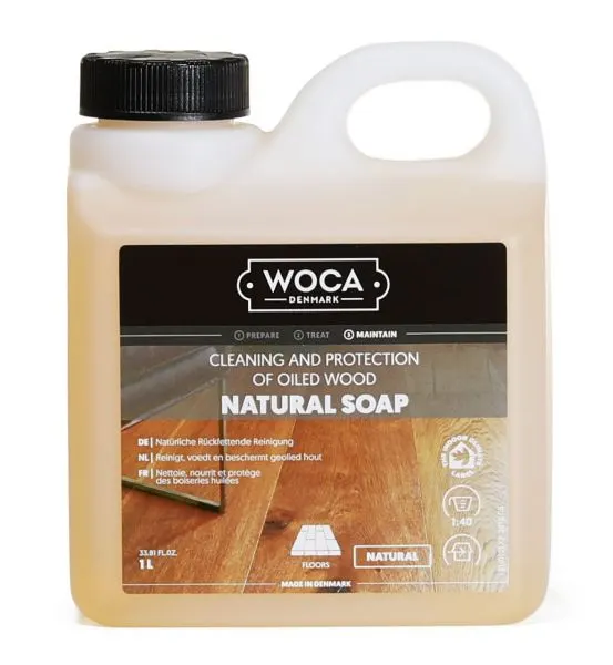 WOCA Holzbodenseife eignet sich zur Reinigung aller natur geölten, gewachsten und geseiften Holzböden. Auch für die Grundbehandlung von Weichholzböden kann sie verwendet werden. WOCA Seife wird ausschließlich aus natürlichen Pflanzenfetten hergestellt. Dabei wird auf Duft- und Zusatzstoffe bewusst verzichtet. Die rückfettende Rezeptur der Holzbodenseife entfernt die alltäglichen Verschmutzungen, ohne das Holz auszulaugen. WOCA Holzbodenseife ist somit geeignet, während der Alltagsreinigung den Boden auch gleichzeitig schonend zu pflegen.
