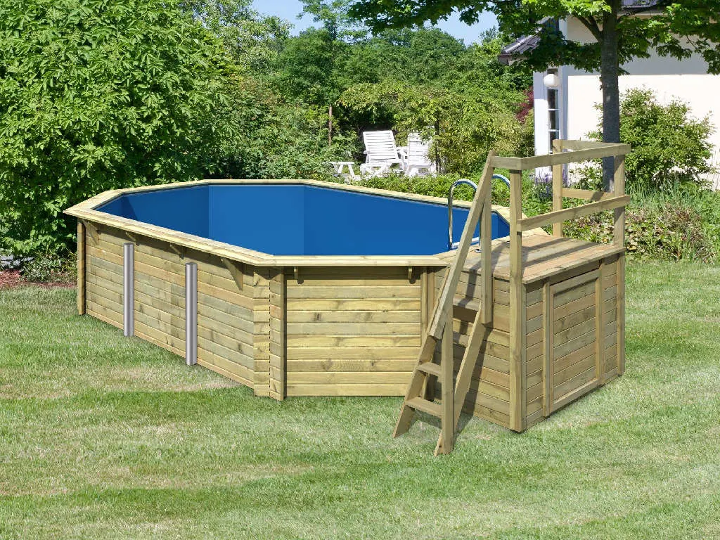 Dieser achteckige Pool fügt sich mit seiner hölzernen Beckenwand harmonisch ins natürliche Gesamtbild deines Gartens ein und macht dabei einen wertigen und soliden Eindruck.