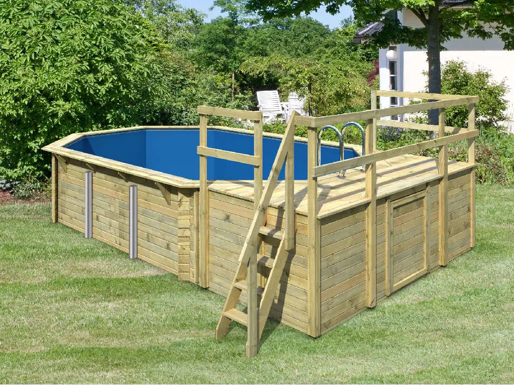 Dieser achteckige Pool fügt sich mit seiner hölzernen Beckenwand harmonisch ins natürliche Gesamtbild deines Gartens ein und macht dabei einen wertigen und soliden Eindruck.