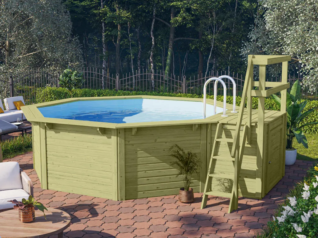 Dieser achteckige Pool fügt sich mit seiner hölzernen Beckenwand harmonisch ins natürliche Gesamtbild deines Gartens ein und macht dabei einen wertigen und soliden Eindruck.
