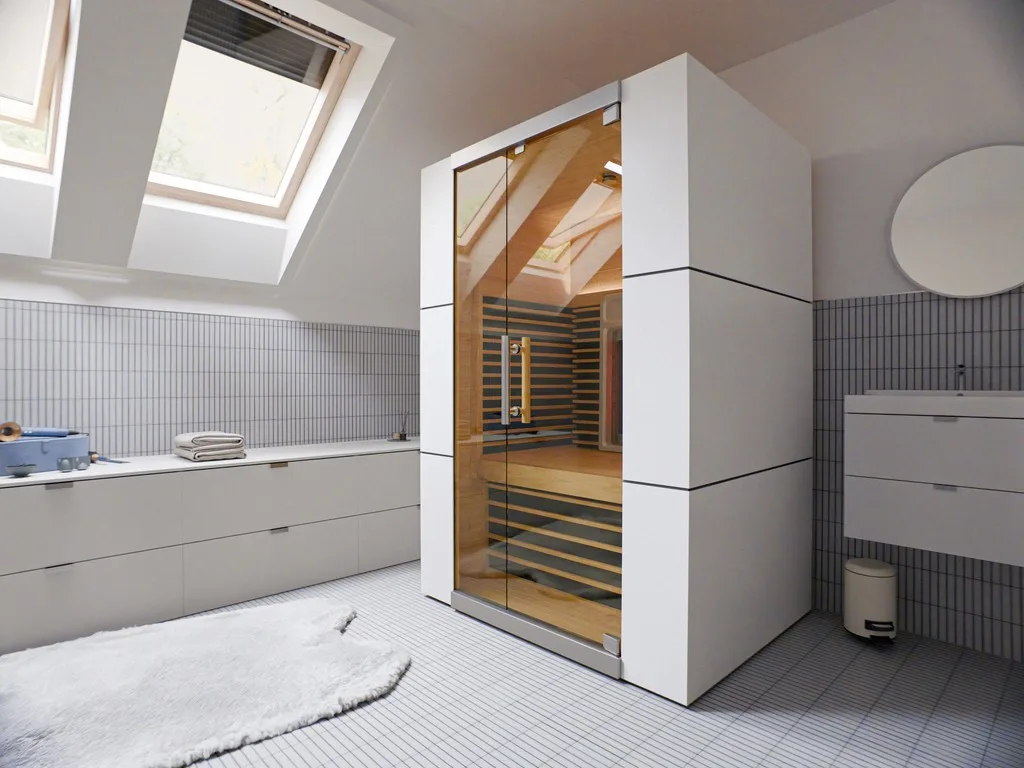Die Infrarotkabine verfügt über eine Ganzglastür aus Klarglas.