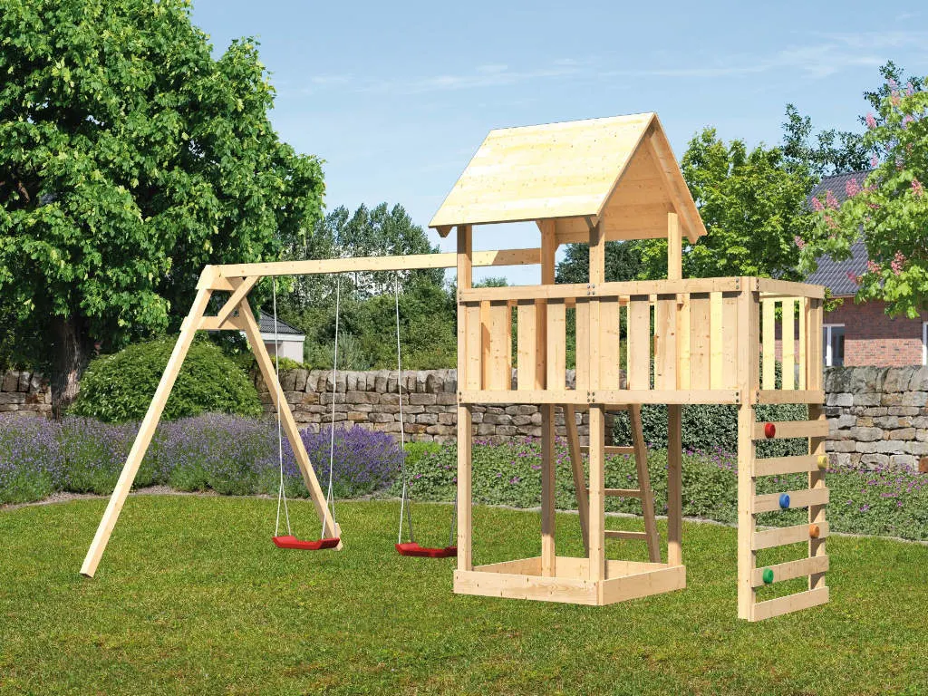 Bei diesem Spielturm steht viel Bewegung auf dem Programm. Die erhöhte Plattform ist über verschiedene Wege zu erreichen, das bietet eine Menge Spiel und Spaß. Vielleicht wird der Spielturm sogar der zentrale Treffpunkt der Kinder aus deiner Nachbarschaft. Die Firsthöhe liegt bei 291 cm.