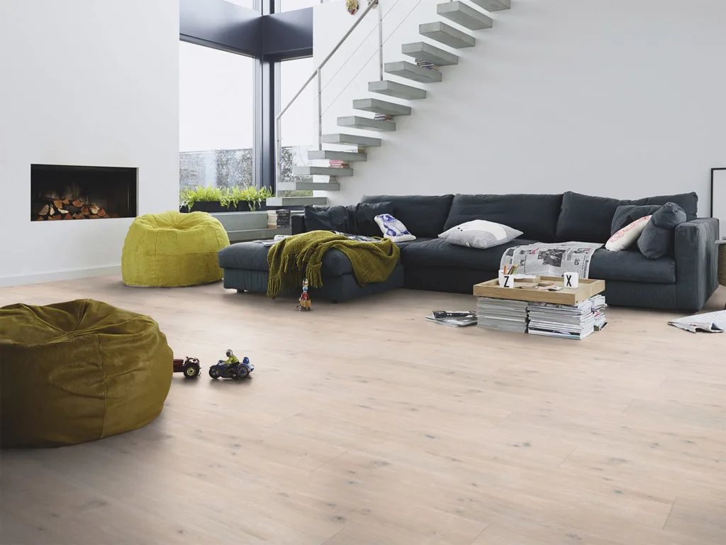 Die schwimmende Verlegung ist problemlos möglich, denn die Dielen besitzen eine praktische Klickverbindung. Mit der Nutzungsklasse (NK) 23 eignet sich der Bodenbelag für stark frequentierte Flächen des privaten Bereichs wie Treppenflure oder Eingangsbereiche. In Wartezimmern, Büros oder Boutiquen mit kontinuierlicher Nutzung kann der Boden mit der Nutzungsklasse (NK) 32 im gewerblichen Bereich punkten. Eine Trittschalldämmung ist in vielen Gebäuden Vorschrift – hier ist sie bereits integriert. Eine zusätzliche Unterlage ist nicht erforderlich und nicht zulässig.