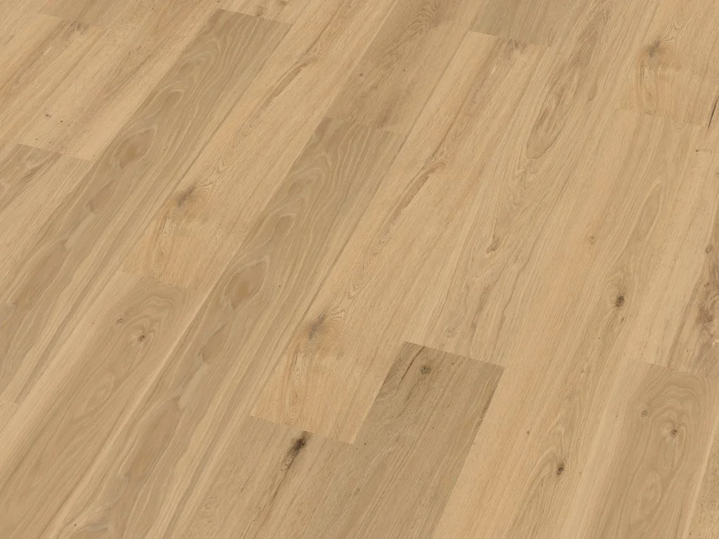 Die typische Eichenholzmaserung des Dekors strahlt zeitlose Klasse und behagliche Wärme aus. Landhausdielen besitzen mit ihrer Ein-Stab-Optik einen natürlichen und rustikalen Look, der jeden Raum gemütlich wirken lässt. Die an vier Seiten umlaufende Fase strukturiert das Verlegebild und verleiht ihm ein gleichmäßiges Muster. Aufgrund der strapazierfähigen Lackversiegelung ist die Oberfläche hervorragend gegen Schmutz, Feuchtigkeit und Kratzer gewappnet.