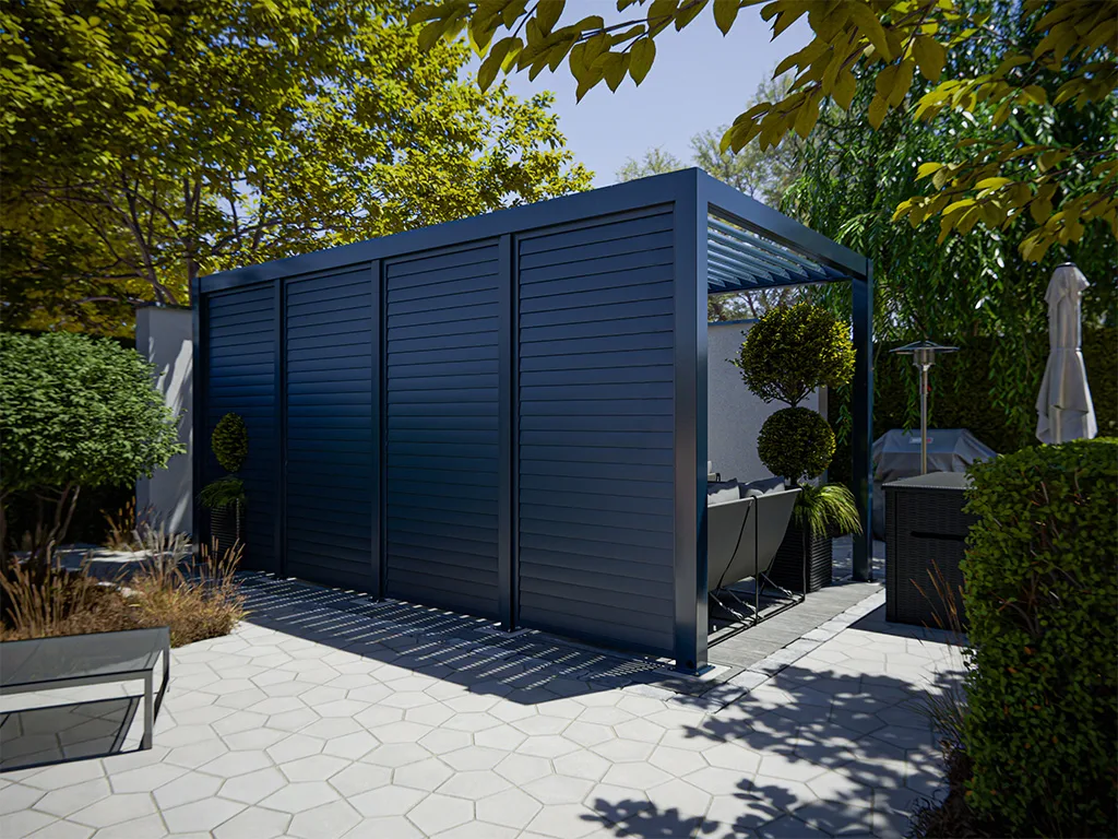Der hochwertige verstellbare Lamellenzaun verleiht deiner Pergola auf stilvolle, funktionale Art zusätzlichen Schutz und Privatsphäre. Dank der doppellagigen Lamellen kannst du den Lichteinfall und die Belüftung individuell anpassen – für maximalen Komfort bei jeder Witterung. Mit seinem modernen Design ergänzt dieser Lamellenzaun nicht nur deine Pergola, sondern wertet deinen gesamten Außenbereich stilvoll auf.