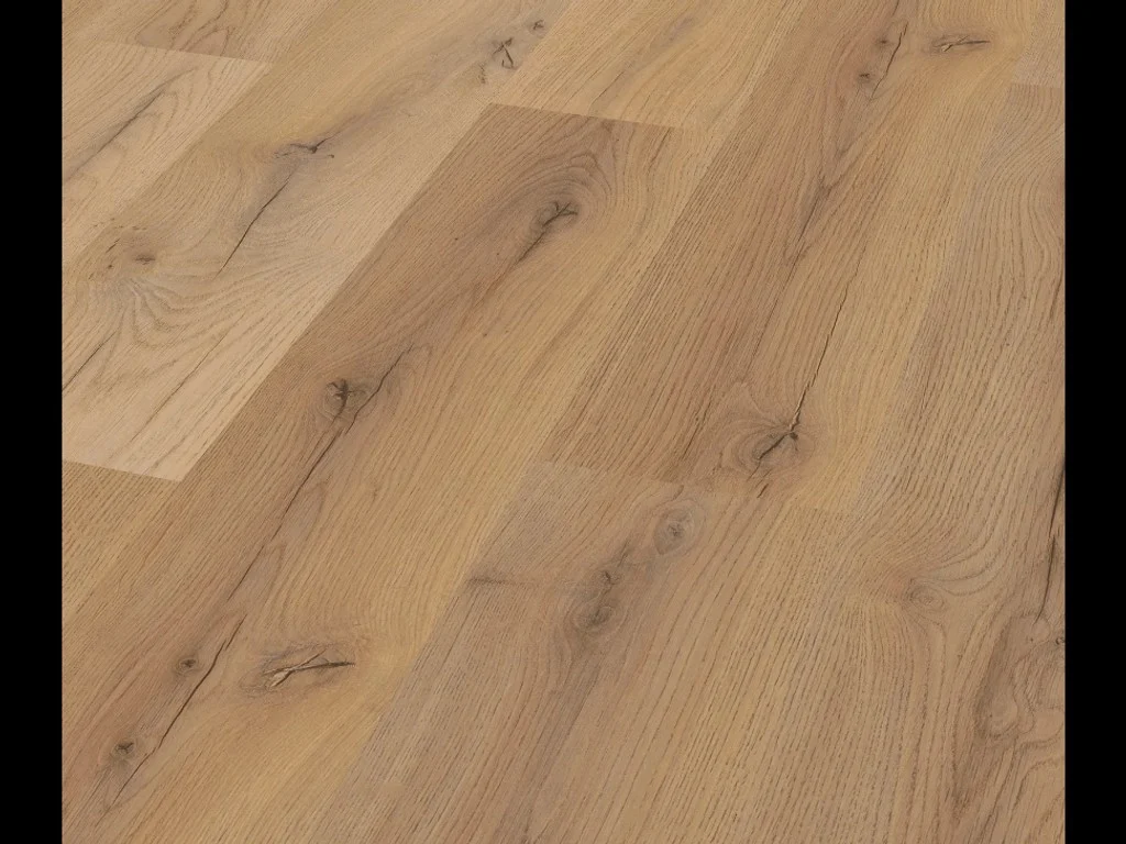 Die typische Eichenholzmaserung des Dekors strahlt zeitlose Klasse und behagliche Wärme aus. Landhausdielen besitzen mit ihrer Ein-Stab-Optik einen natürlichen und rustikalen Look, der jeden Raum gemütlich wirken lässt. Die 4-seitig umlaufende V-Fuge betont die Dielenoptik.