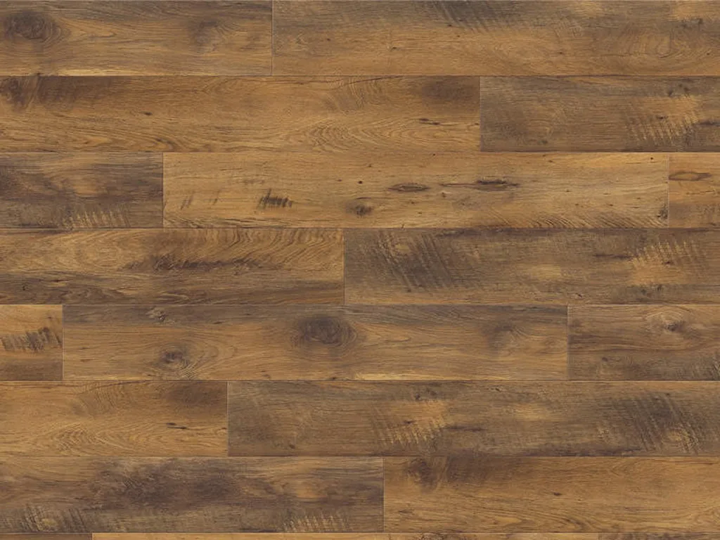 Das Dekor in authentischer Eichenholzoptik vermittelt fühlbare Wärme und Behaglichkeit. Landhausdielen besitzen mit ihrer Ein-Stab-Optik einen natürlichen und rustikalen Look, der jeden Raum gemütlich wirken lässt. Die an vier Seiten umlaufende Fase strukturiert das Verlegebild und verleiht ihm ein gleichmäßiges Muster. Mithilfe aufwendiger und moderner Prägetechnologie verfügt der Boden über eine Oberfläche, die bis ins kleinste Detail feinste Holzstrukturen nachempfindet.